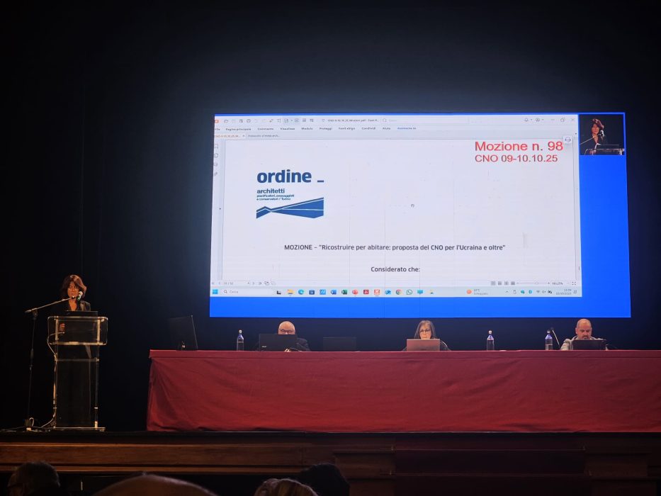 Durante la Conferenza l’Ordine di Torino ha presentato la mozione “Ricostruire per abitare: proposta della CNO per l’Ucraina e oltre”, che è stata ufficialmente accolta. È stato infatti deliberato che, tra i vari punti, l’Ordine degli Architetti di Torino guiderà il coordinamento tra Ordini con focus sull’housing e la ricostruzione in Ucraina.